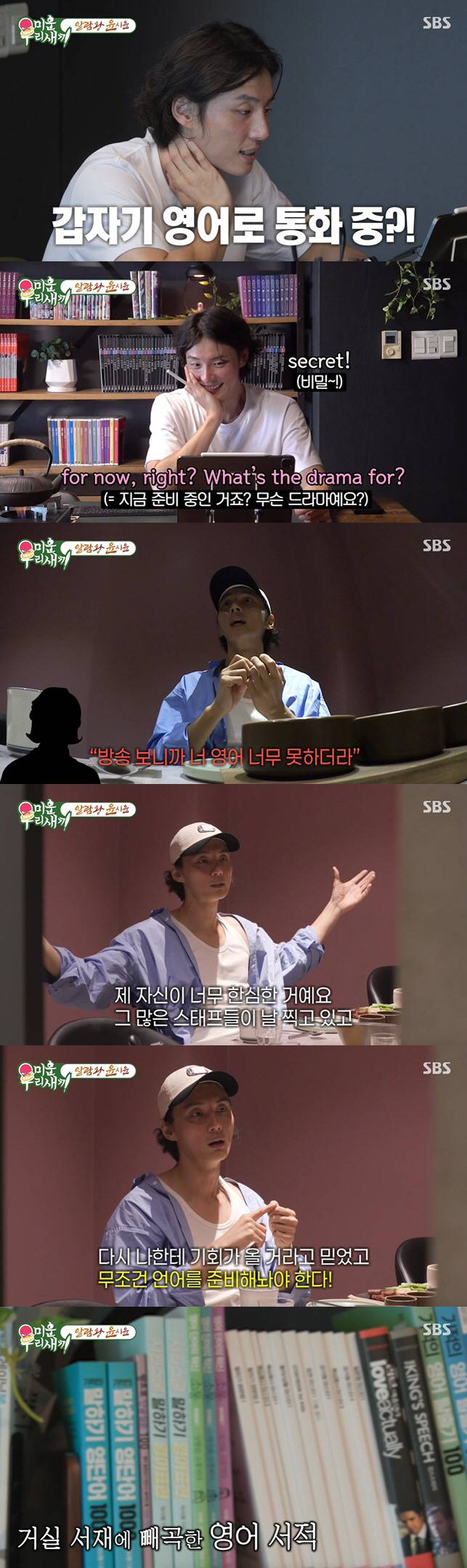 지난해 필리핀 어학연수를 다녀온 윤시윤 씨는 영어 실력 향상을 위해 꾸준히 노력하고 있으며, 거실 서재에는 영어 서적이 빼곡히 자리 잡고 있습니다.